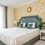 Акцентну стіну в спальні можна виділити шпалерами з яскравим малюнком або орнаментом