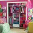 Системи зберігання повинні бути достатньо місткими, щоб всі дитячі речі могли без праці зберігатися в одній кімнаті – одяг та взуття (в т. ч. і сезонна), іграшки, навчальні матеріали, книги, набори для творчості та хобі (розкладні столики, мольберти, ролики, спортивний інвентар тощо). Фото шаф в дитячих кімнатах для дівчаток демонструють симпатичні приклади як закритих, так і відкритих моделей.