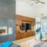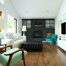 Щоб продовжити термін служби матеріалу, всі дерев’яні елементи каміна слід обробити спеціальними захисними просоченнями. У простір вітальні, виконаний в сучасному стилі, підійде інший варіант дизайну – монтаж каміна в перегородку. В якості обробки використовуються дерев’яні панелі з красивою текстурою. Оскільки електричні каміни не топляться дровами, в перегородку над вогнищем можна сміливо вбудовувати плаский телевізор.