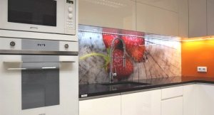 Основна перевага скляних панелей перед усіма іншими – ідеально гладка поверхня, в порах і мікроскопічних подряпинах якої не може накопичуватися бруд і пил. Єдине, на що варто звернути увагу в процесі установки скинали – відстань між джерелом відкритого вогню і панеллю повинно бути не менше 7 див. Це пов’язано з ризиком пошкодження малюнка на панелі, а в деяких випадках і самого матеріалу.